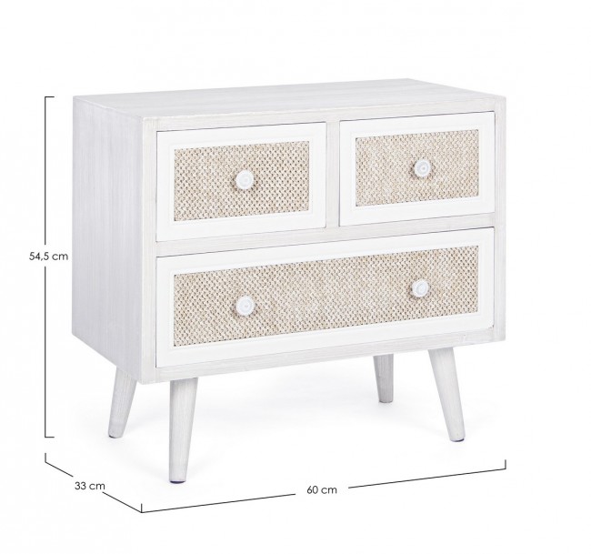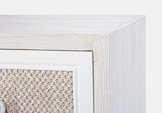 MDF. FRONTALE CASSETTO RIVESTITO IN TESSUTO (COTONE/LINO). FINITURA CON VERNICE A BASE D’ACQUA. POMELLI IN METALLO. PIEDINI DA ASSEMBLARE.