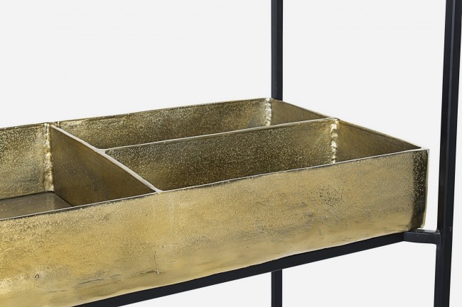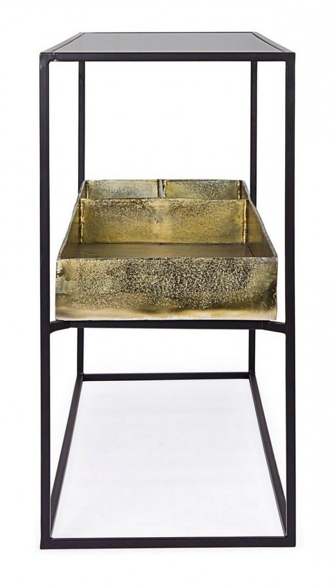 STRUTTURA IN ACCIAIO VERNICIATA A POLVERE EPOSSIDICA. PIANO SUPERIORE IN VETRO TEMPERATO. PIANO INFERIORE CON CONTENITORE IN ALLUMINIO CON FINITURA PLACCATA OTTONE ED ANTICATA.