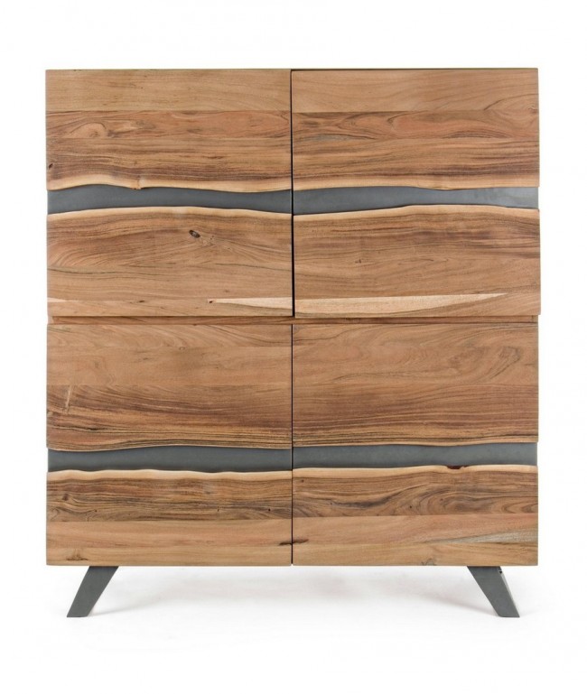 STRUTTURA IN LEGNO DI ACACIA, GAMBE IN ACCIAIO VERNICIATO A POLVERE EPOSSIDICA. PORTE CON INSERTI IN METALLO. FINITURA A BASE DI VERNICE POLIURETANICA. VANO PORTA COMPRENSIVO DI MENSOLA. GAMBE DA ASSEMBLARE.