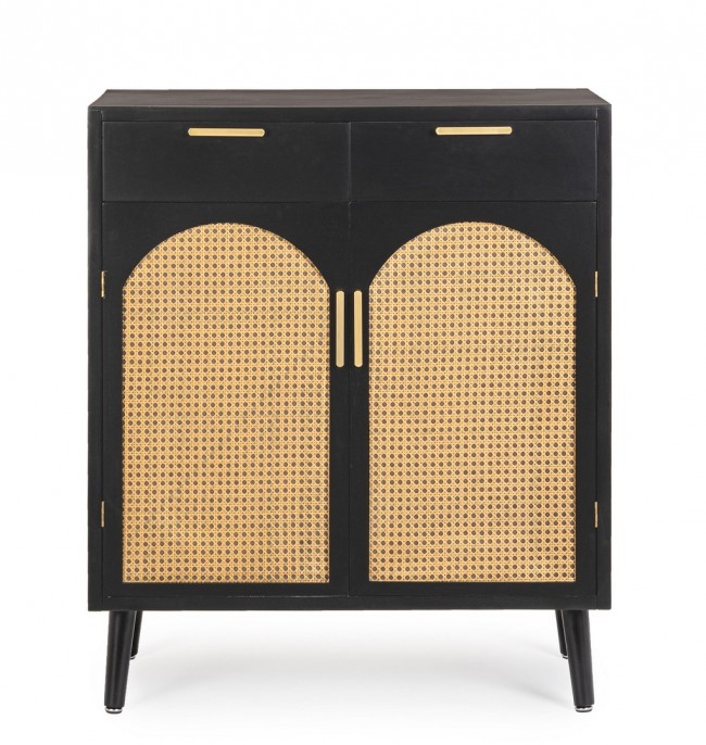 STRUTTURA IN LEGNO DI PINO, PIANO E SCHIENALE IN MDF. ANTE E CASSETTI IN MDF CON INSERTI IN RATTAN. GAMBE IN LEGNO DI PINO. FINITURA A BASE DI NITROCELLULOSA. MANIGLIE IN ACCIAIO. GAMBE DA ASSEMBLARE.
