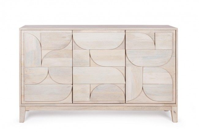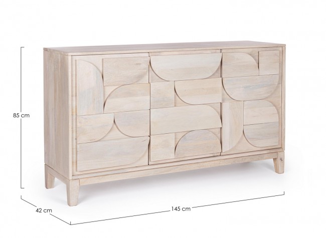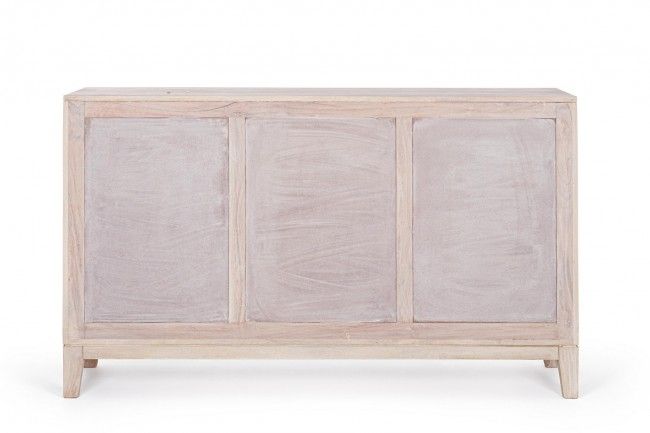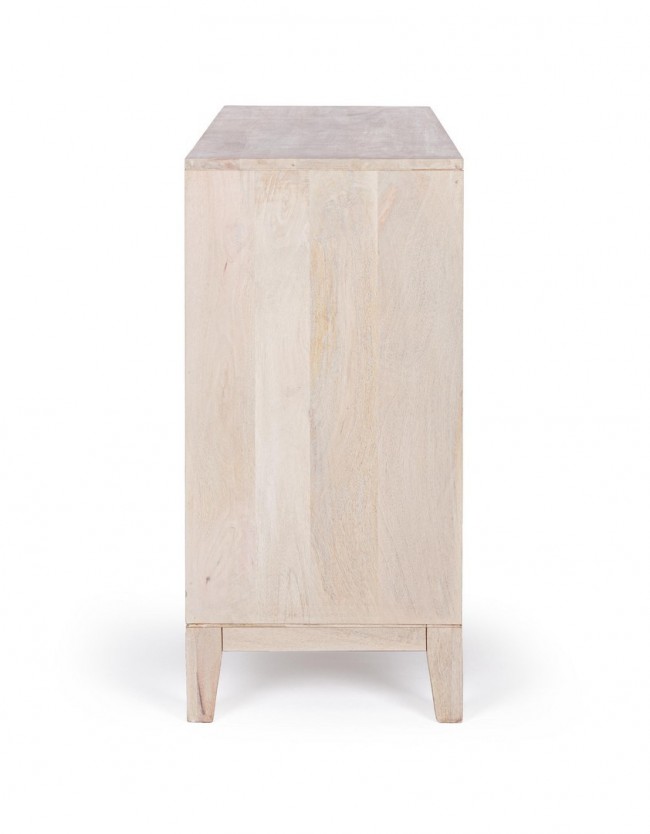 STRUTTURA IN LEGNO DI MANGO, SCHIENALE IN MDF. VERNICIATURA A BASE DI NITROCELLULOSA CON DECAPATURA BIANCA. VANO PORTA COMPRENSIVO DI MENSOLA.