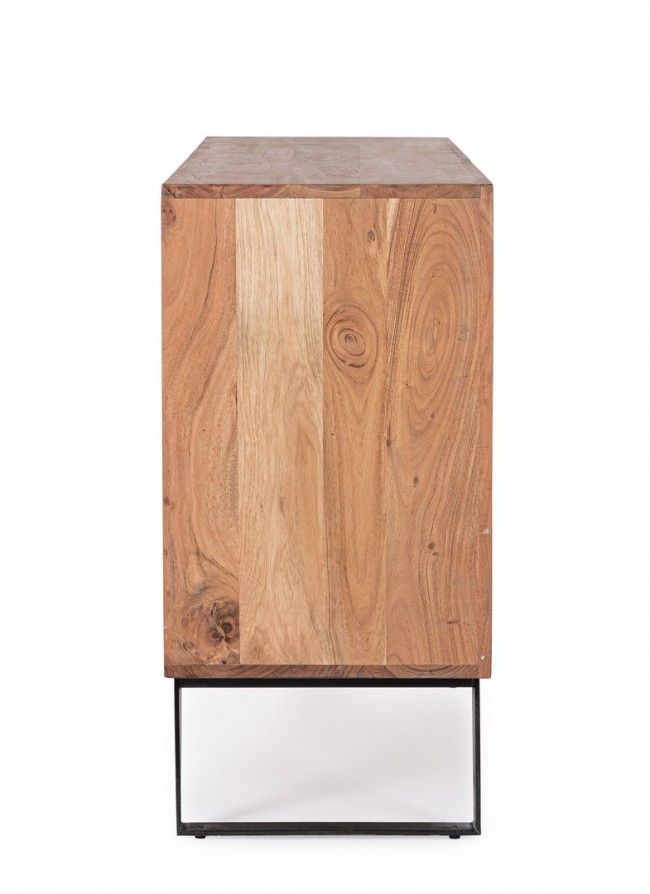 STRUTTURA IN LEGNO DI ACACIA, SCHIENALI IN COMPENSATO. FRONTALI ANTE INTARSIATI E LAVORATI A MANO. FINITURA ACRILICA PROTETTIVA. MANIGLIE E GAMBE IN ACCIAIO. GAMBE DA ASSEMBLARE.