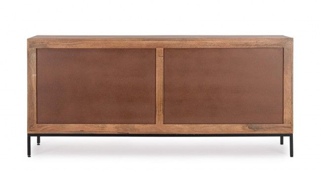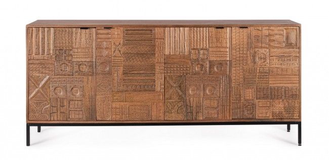 STRUTTURA IN LEGNO MANGO MASSICCIO, SCHIENALE IN MDF. VERNICIATURA A BASE DI NITROCELLULOSA. GAMBE E MANIGLIE IN ACCIAIO. FRONTALE CASSETTI ED ANTE INTARSIATI E LAVORATI A MANO. VANO PORTA COMPRENSIVO DI MENSOLA. GAMBE DA ASSEMBLARE.