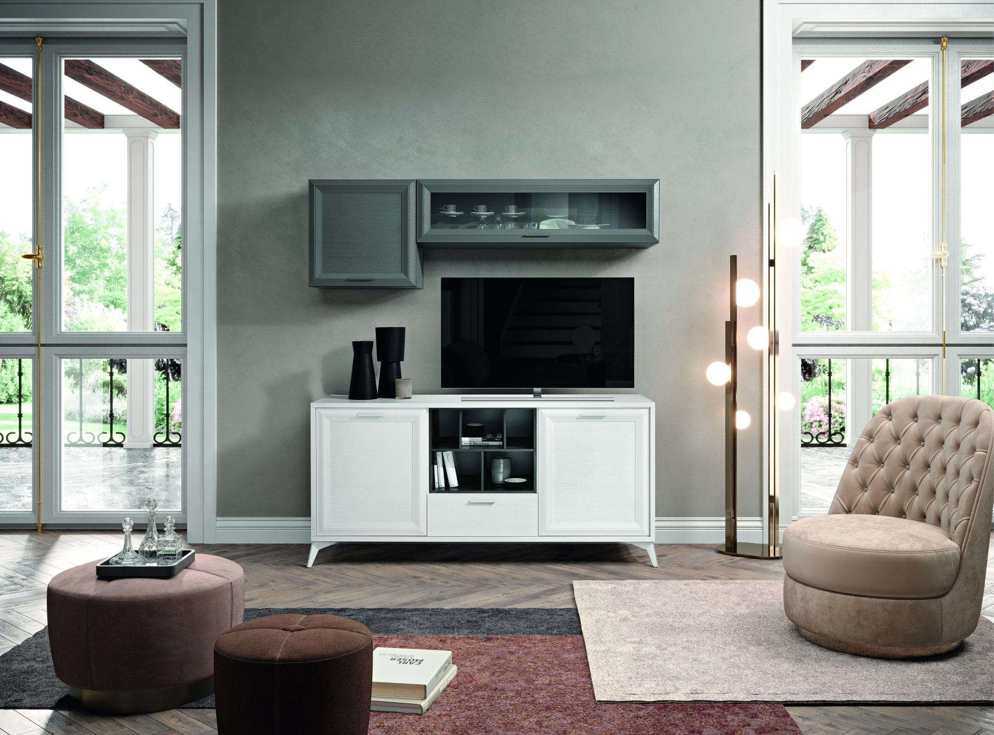 Fantastico living della collezione contemporanea di Gierre Mobili in nobilitato nei colori bianco frassino e grigio .