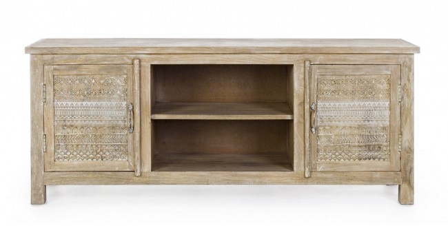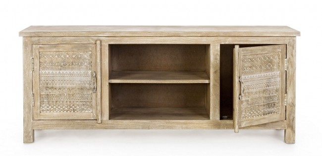 STRUTTURA IN LEGNO DI MANGO CON DECORAZIONI INTARSIATE A MANO, SCHIENALE IN MDF. FINITURA A BASE DI NITROCELLULOSA. MANIGLIE IN OTTONE.