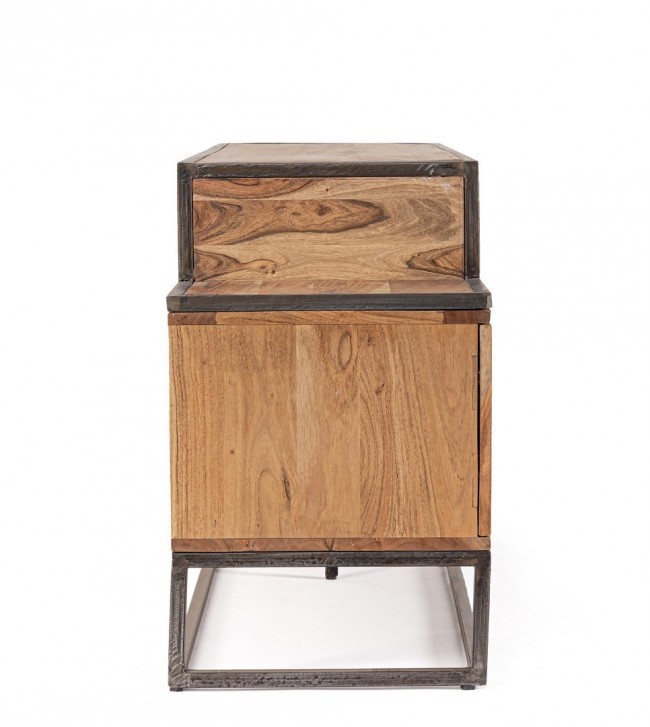 STRUTTURA IN LEGNO D’ACACIA E ACCIAIO VERNICIATO A POLVERE EPOSSIDICA, SCHIENALE IN COMPENSATO. FINITURA ACRILICA PROTETTIVA. CASSETTI E MANIGLIE IN ACCIAIO.