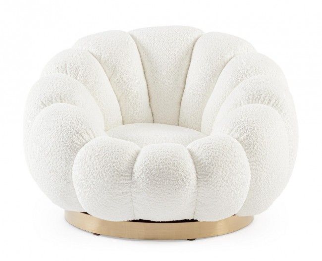 STRUTTURA IN COMPENSATO. RIVESTIMENTO IN POLIESTERE EFFETTO BOUCLE’. IMBOTTITURA IN SCHIUMA POLIURETANICA (DENSITA’ 25KG/M3 SEDUTA, 18KG/M3 SCHIENALE). FONDO CON ANELLO DECORATIVO IN ACCIAIO VERNICIATO COLOR ORO. SEDUTA GIREVOLE A 360¬∞.