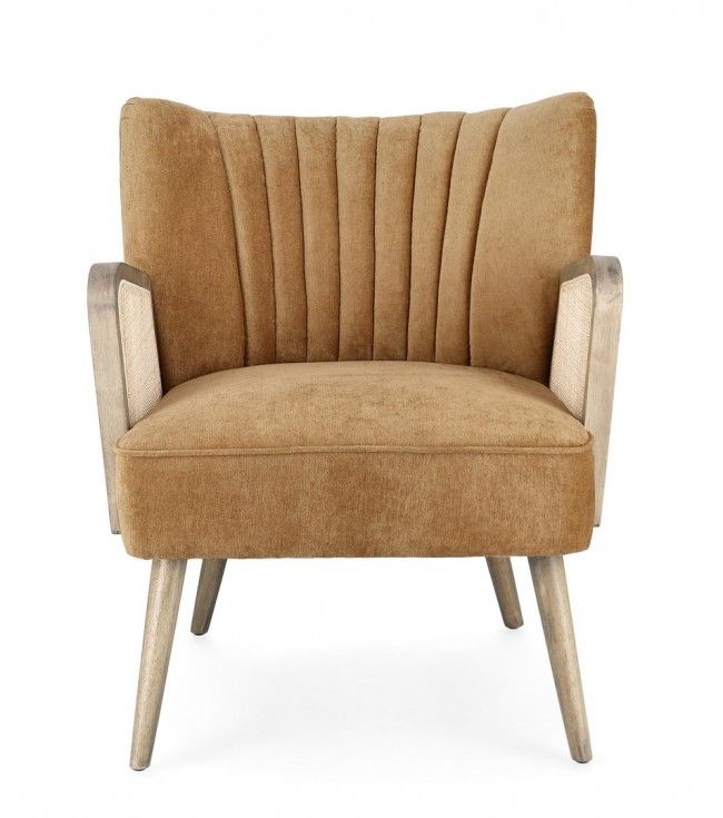 STRUTTURA IN LEGNO DI PINO E COMPENSATO. GAMBE IN RUBBERWOOD. BRACCIOLI CON INSERTI IN RATTAN. RIVESTIMENTO IN POLIESTERE. DENSITA’ IMBOTTITURA IN SCHIUMA POLIURETANICA 24 KG/M3. NON SFODERABILE. GAMBE DA ASSEMBLARE.