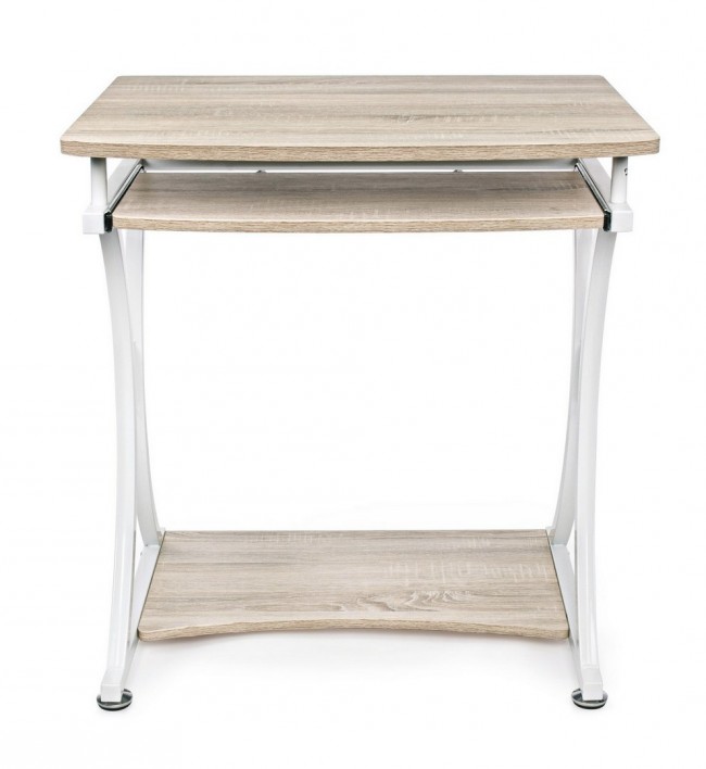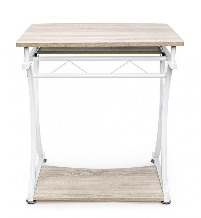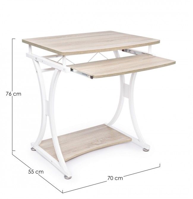 STRUTTURA IN ACCIAIO VERNICATO A POLVERE. PIANI IN MDF RIVESTITI CON CARTA MELAMINICA EFFETTO LEGNO. DOTATA DI PORTA TASTIERA ESTRAIBILE. DA ASSEMBLARE