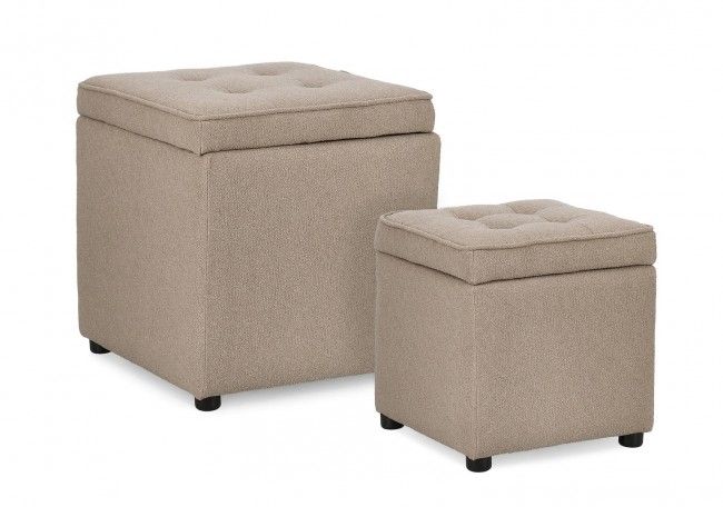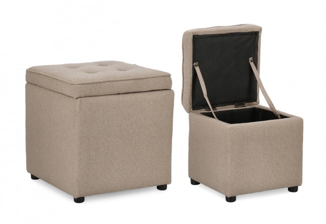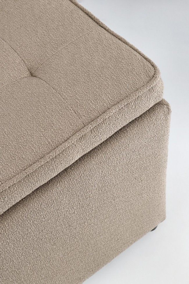 STRUTTURA IN LEGNO DI PINO, PIEDINI IN PLASTICA (PP), RIVESTIMENTO ESTERNO IN POLIESTERE EFFETTO BOUCLE’, RIVESTIMENTO INTERNO IN POLIESTERE. CON CONTENITORE. DA ASSEMBLARE.