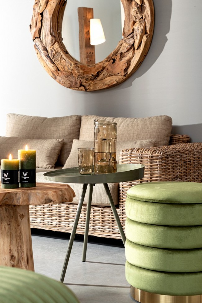 STRUTTURA IN MDF E COMPENSATO. RIVESTIMENTO IN POLIESTERE EFFETTO VELLUTO. DENSITA’ IMBOTTITURA 30KG/M3. FONDO CON ANELLO DECORATIVO IN ACCIAIO VERNICIATO COLOR ORO.